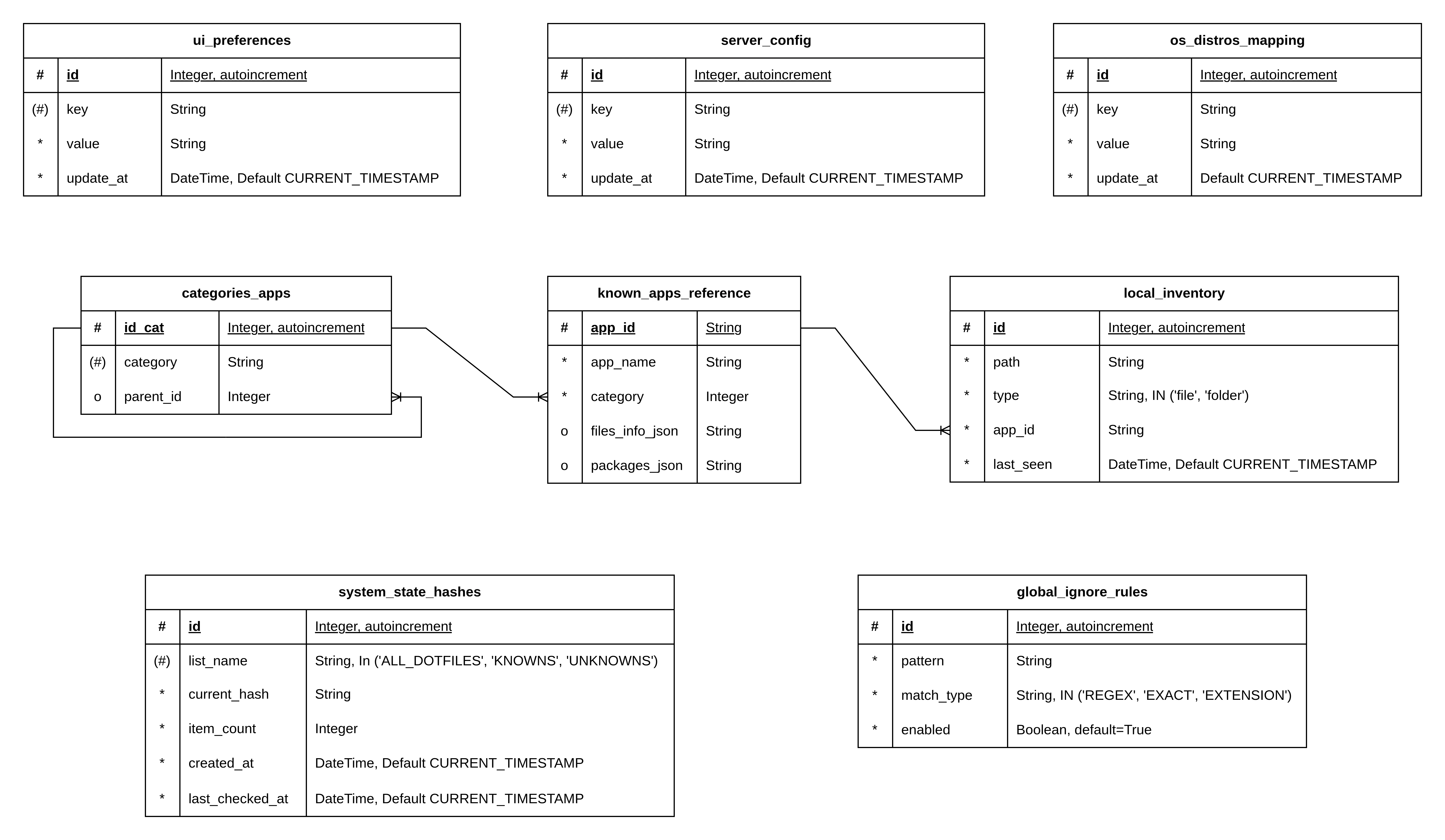 local_inventory(N:1): El núcleo de la persistencia. Registra qué dotfiles existen físicamente en la máquina local (rutas, tipo de archivo) y los vincula a su aplicación correspondiente medianteapp_id.