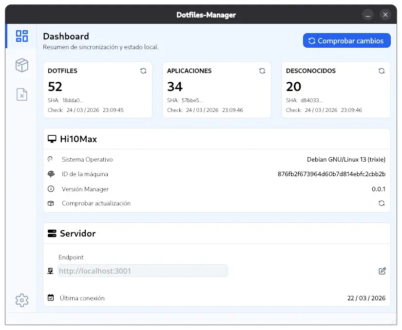 main_check— Comprobación completa (todos los hashes).check_dotfiles— Solo hash de todos los dotfiles.check_apps— Solo hash de aplicaciones conocidas.check_unknown— Solo hash de desconocidos.