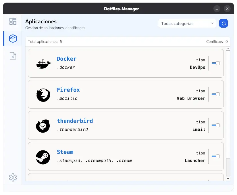 La vista de Aplicaciones es el núcleo interactivo del inventario. Muestra el catálogo completo del software reconocido por la herramienta: cada aplicación con sus metadatos (nombre, categoría, icono si está disponible) y la lista de rutas de dotfiles que tiene asociadas en el sistema local.